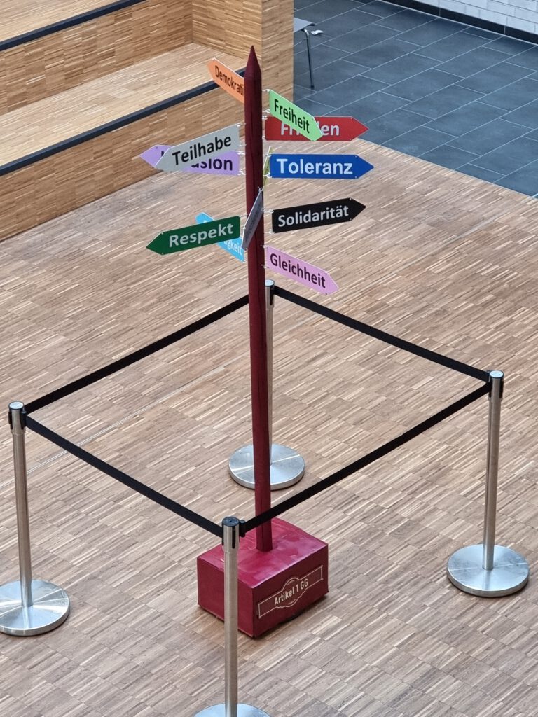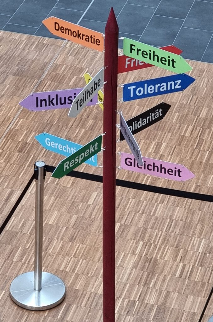 Wir bauen mit Kindern und Jugendlichen einen „Demokratie-Wegweiser“. Das heißt, einen Wegweiser mit zahlreichen demokratischen Begriffen, die in versch. Himmelsrichtungen zeigen. Zum Beispiel die Begriffe, Freiheit, Frieden, Gleichheit, Teilhabe etc.