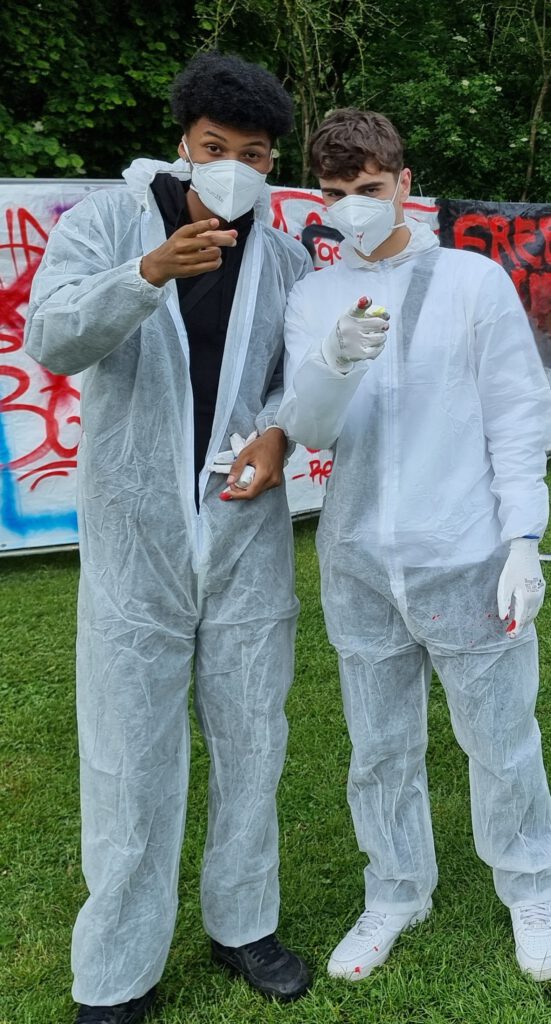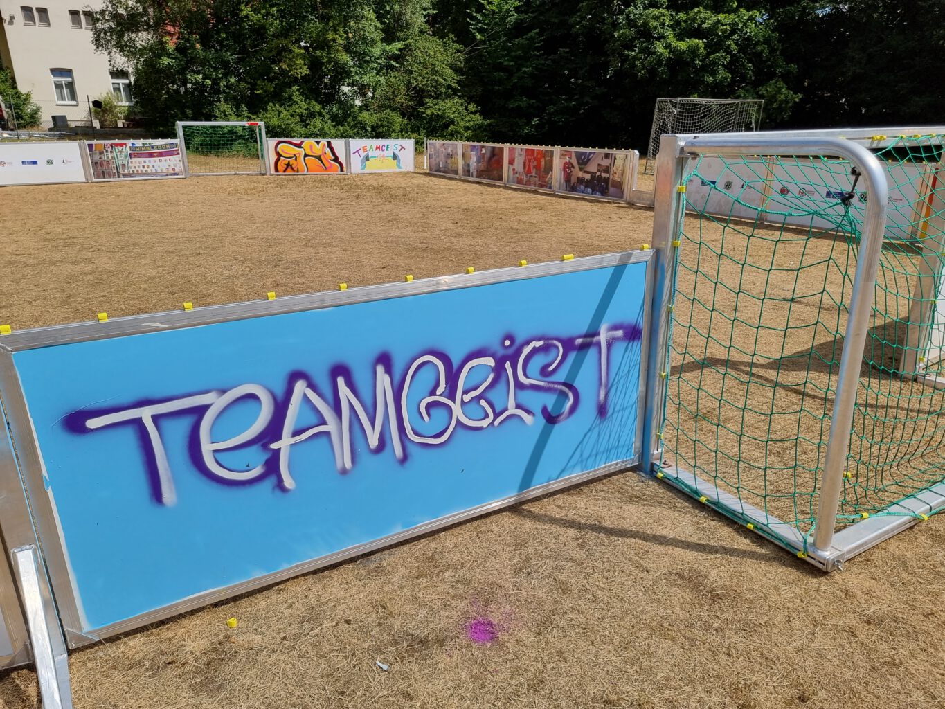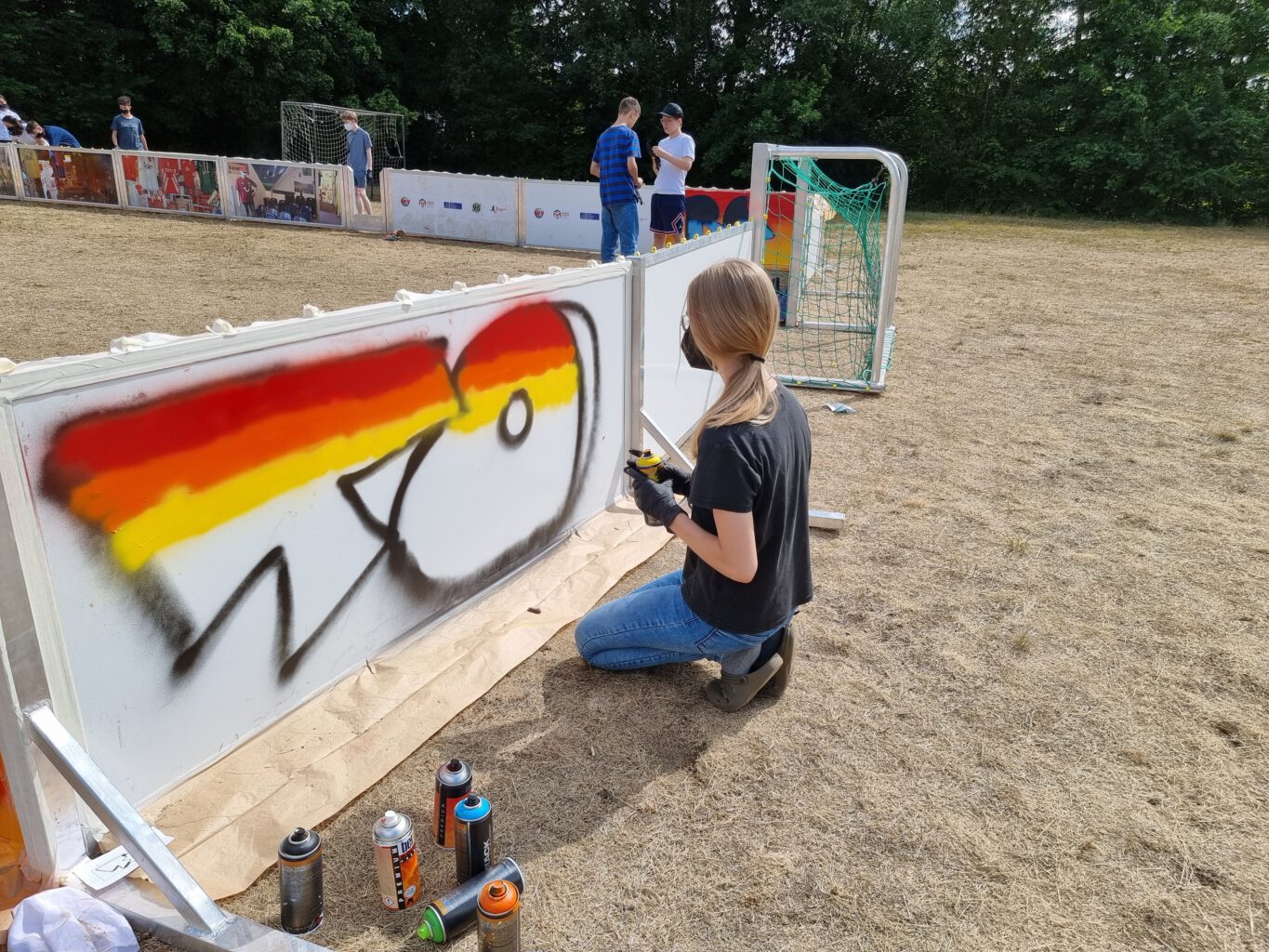 Es entstanden daraus wundervolle kreative Bilder und Illustrationen, die die Ideen der Jugendlichen widerspiegeln. Alle Kunstwerke wurden auf Banner gesprayt oder später rund um ein Fußballfeld geklebt, auf dem anschließend die ein gemeinsames Fußballturnier stattfand.