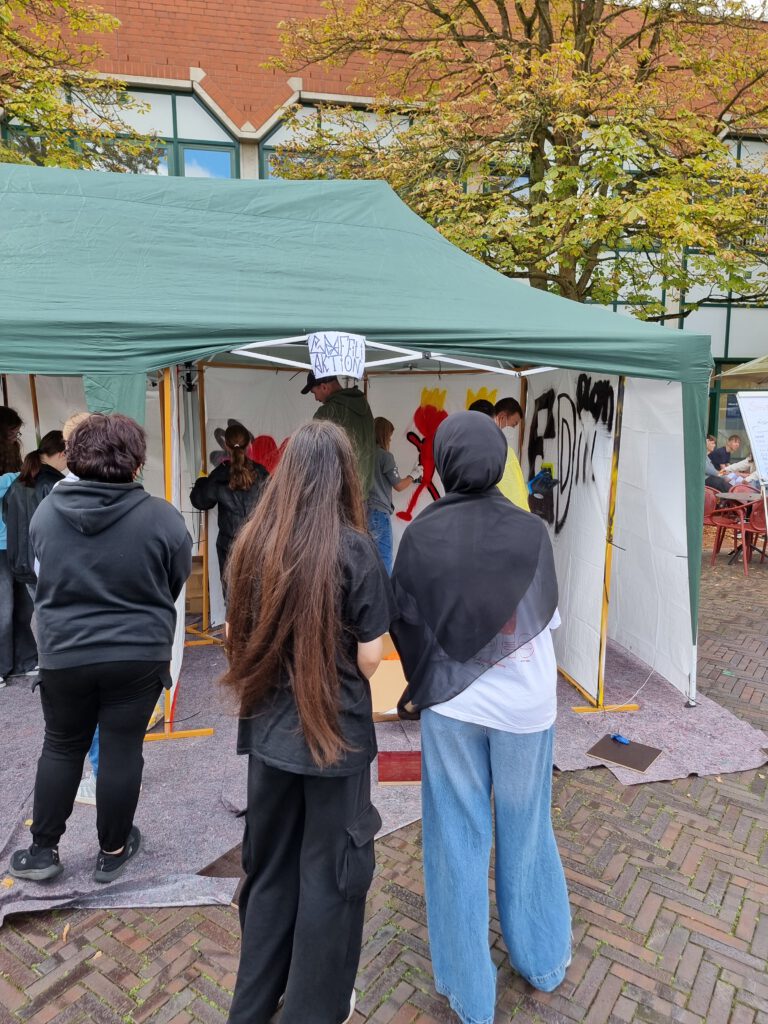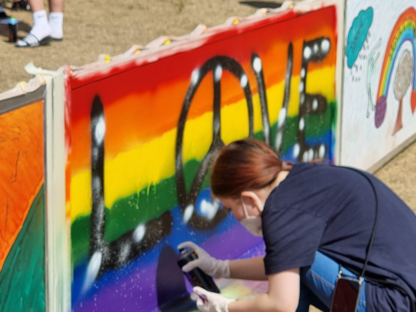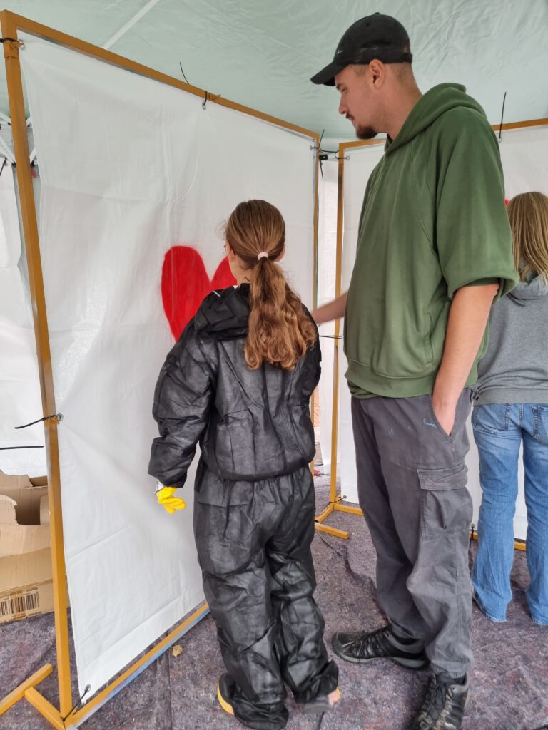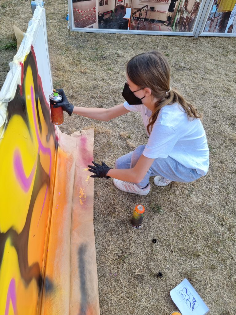 Es entstanden daraus wundervolle kreative Bilder und Illustrationen, die die Ideen der Jugendlichen widerspiegeln. Alle Kunstwerke wurden auf Banner gesprayt oder später rund um ein Fußballfeld geklebt, auf dem anschließend die ein gemeinsames Fußballturnier stattfand.